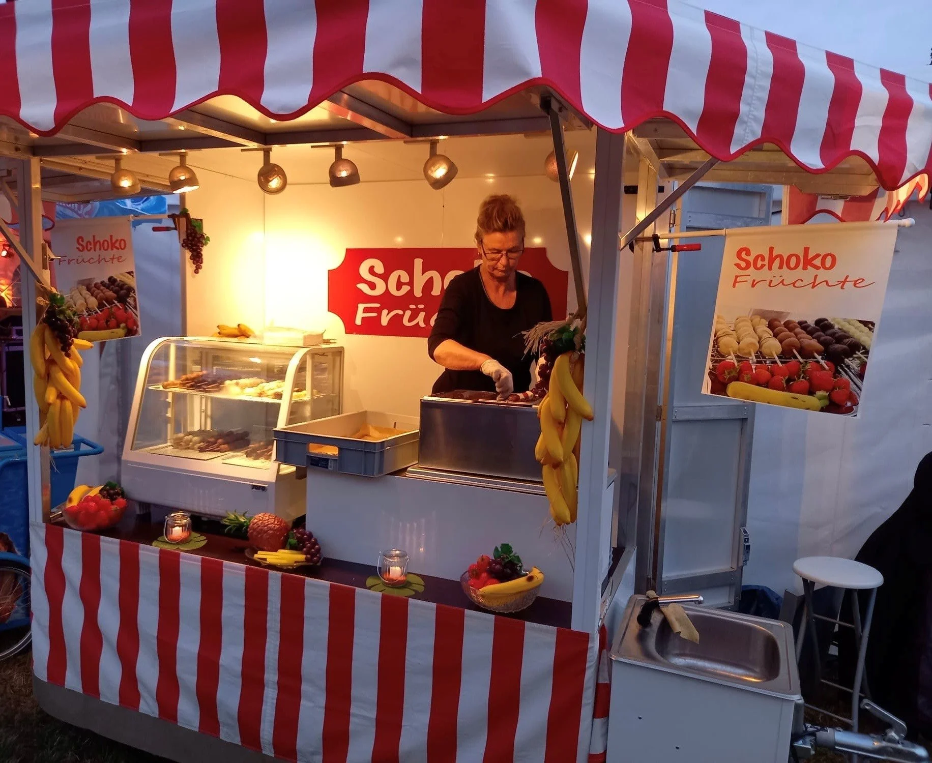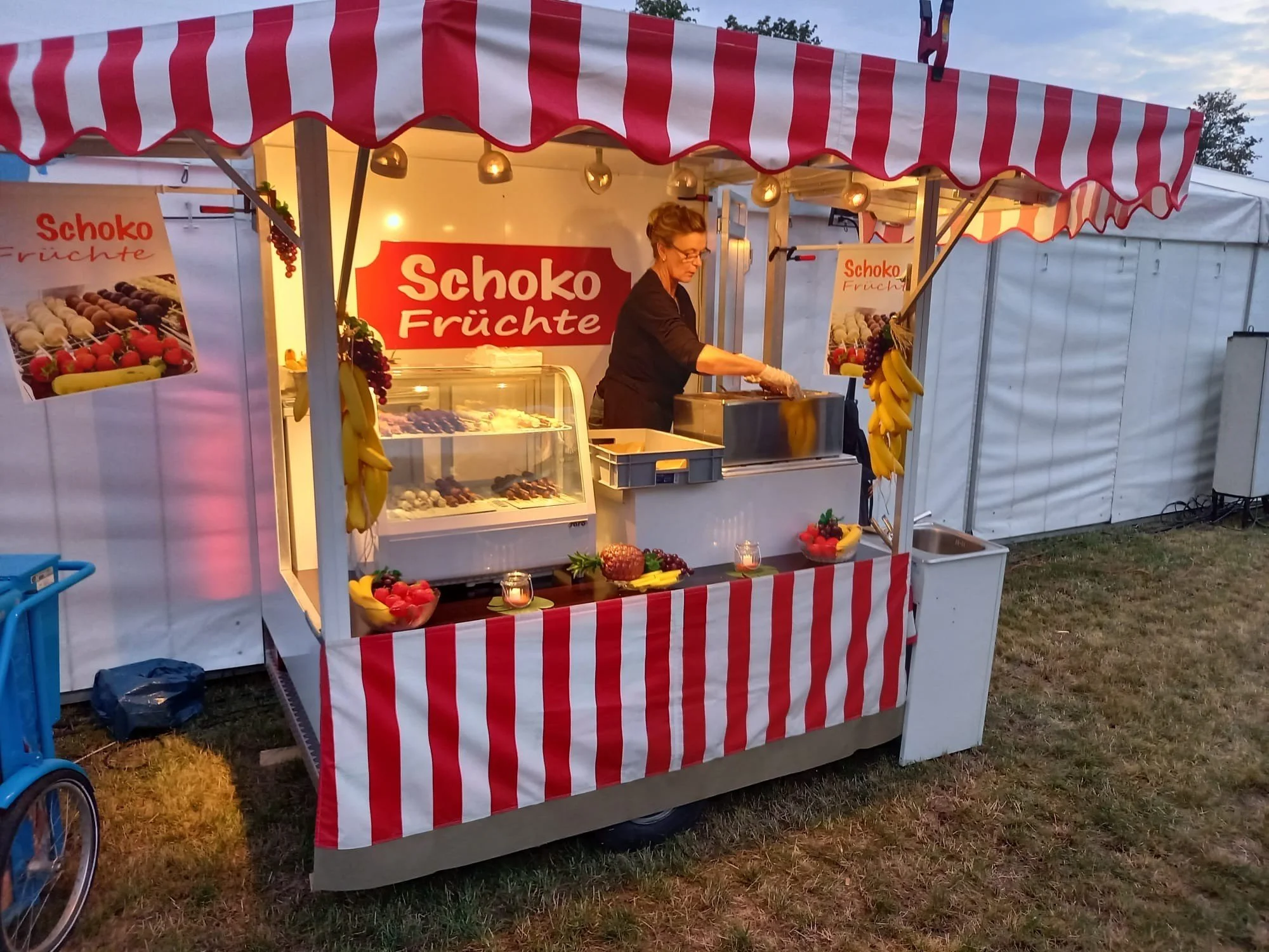 Leckere Fruchtspieße mit Schokolade überzogen - stets frisch! Welche Sorte mögen Sie am liebsten?